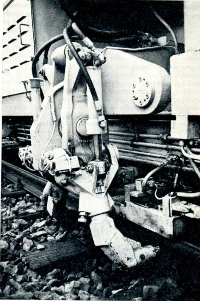 Sur le second type de bourreuse, la ligne de référence est réalisée par un dispositif hydraulique de palpage. On prend appui sur la voie, d’une part, au moyen d’un stabilisateur (photo 6) huit mètres devant la bourreuse, et d’autre part, immédiatement derrière la machine par l’intermédiaire du pendule hydraulique (photo 7), qui intervient également dans le nivellement transversal. Le levage de la voie s’effectue jusqu’à obtention d’une butée hydraulique.
