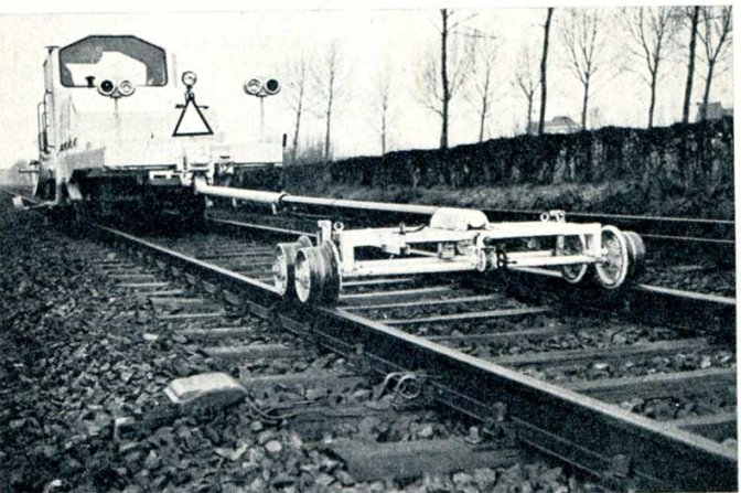 Le second type de dresseuse (photo 11) est pourvu d’une seule corde qui permet d’effectuer l’enregistrement continu des flèches de la voie à riper (photo 12) ; après correction graphique du diagramme relevé, la voie est ripée jusqu’à coïncidence des flèches réelles avec le diagramme corrigé. Lorsque la voie ne présente pas de trop grands défauts, le ripage peut se faire automatiquement au moyen d’un stylet photo-électrique qui effectue « la lecture » du diagramme corrigé et commande les ripages correspondants.