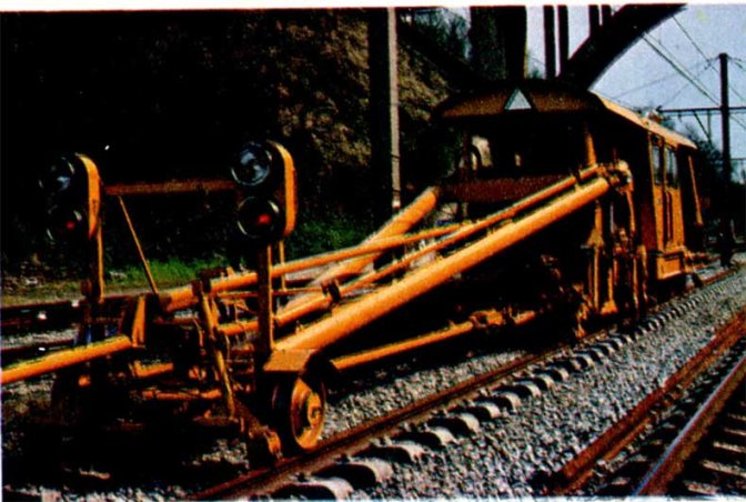 Ces dernières années, le parc s’est agrandi : par l’acquisition de 2 dresseuses d’appareils de voie (photo 16). Les efforts de ripage nécessaires à la remise en place des appareils de voie sont obtenus au moyen d’une masse mobile de 1 200 kg, qui est logée sous la machine et qui est accélérée par l’intermédiaire de cylindres hydrauliques.